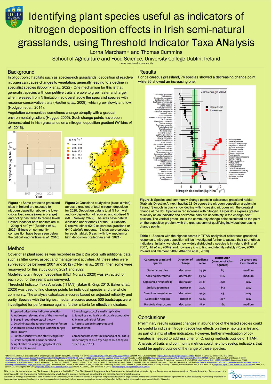 Marcham, Lorna and Thomas Cummins, 2022. Identifying plant species useful as indicators of nitrogen deposition effects in Irish semi-natural grasslands, using Threshold Indicator Taxa ANalysis. Poster presented at British Ecological Society Annual Meeting 2022, Edinburgh. [pdf from NEC Indicators]